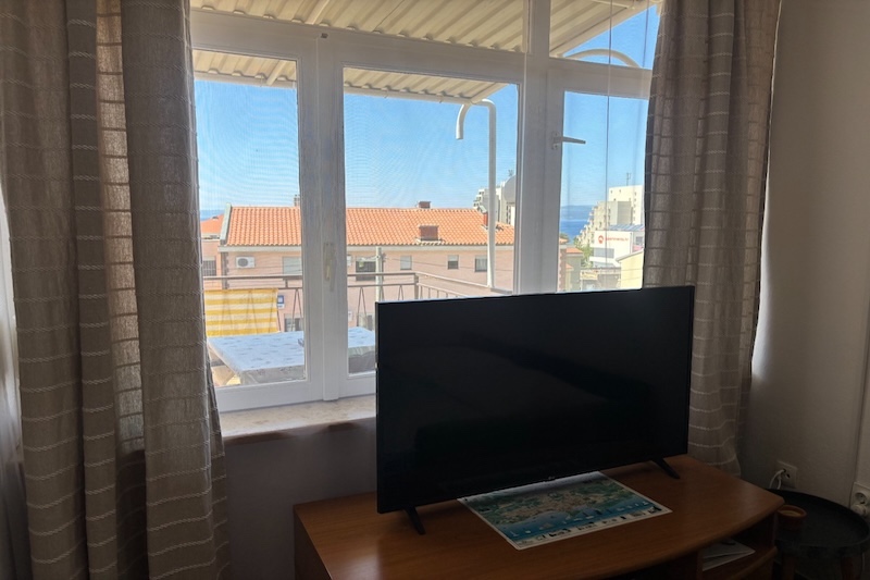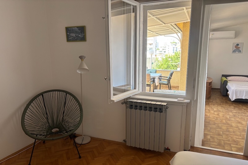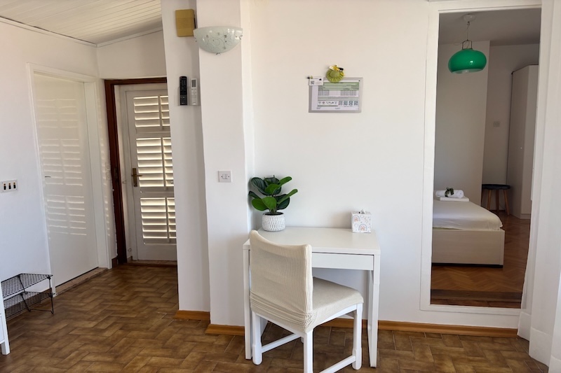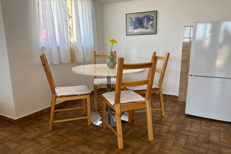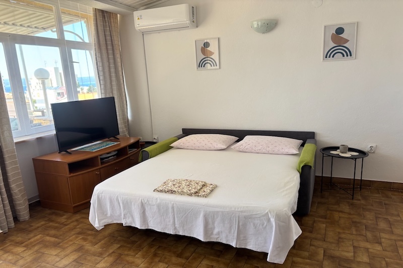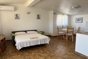 Ground floor, East, studio apartment, 2 + 1 persons, living room/bedroom, kitchenette and small dining room, bathroom, terrace, TV, satellite, Wireless Internet, Air Conditioning, separate entrance and available parking space