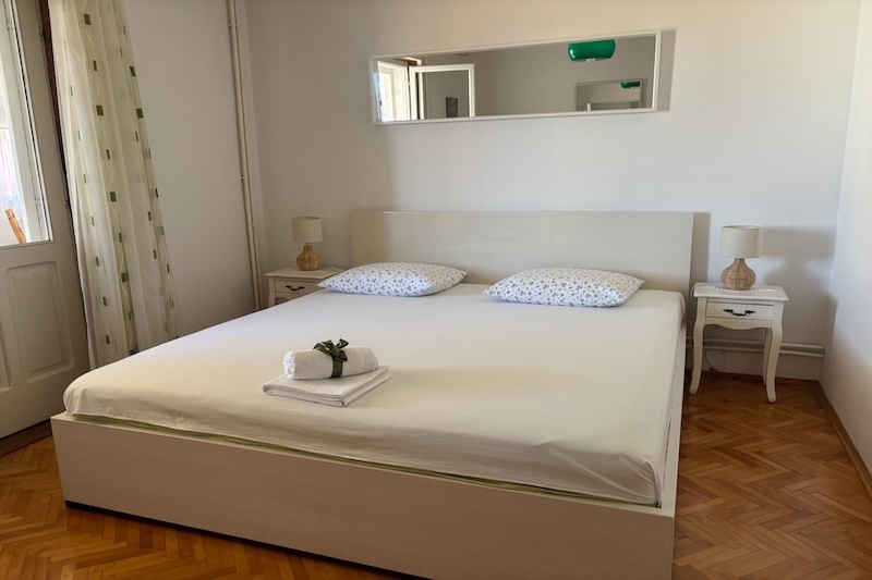 First floor, North-South, 3 + 1 persons, 2 bedrooms, kitchen and large dining/living room, bathroom, balcony, TV, satellite, Wireless Internet, Air Conditioning, separate entrance and available parking space